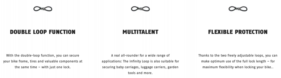 The Infinity Loop is ideal if you want to connect two bikes together or use a bike rack for your car, for example. You can also easily secure a bicycle trailer, a cargo bike with a wealth of high-quality components or pushchairs, barbecues and high-quality appliances with the Infinity Loop.