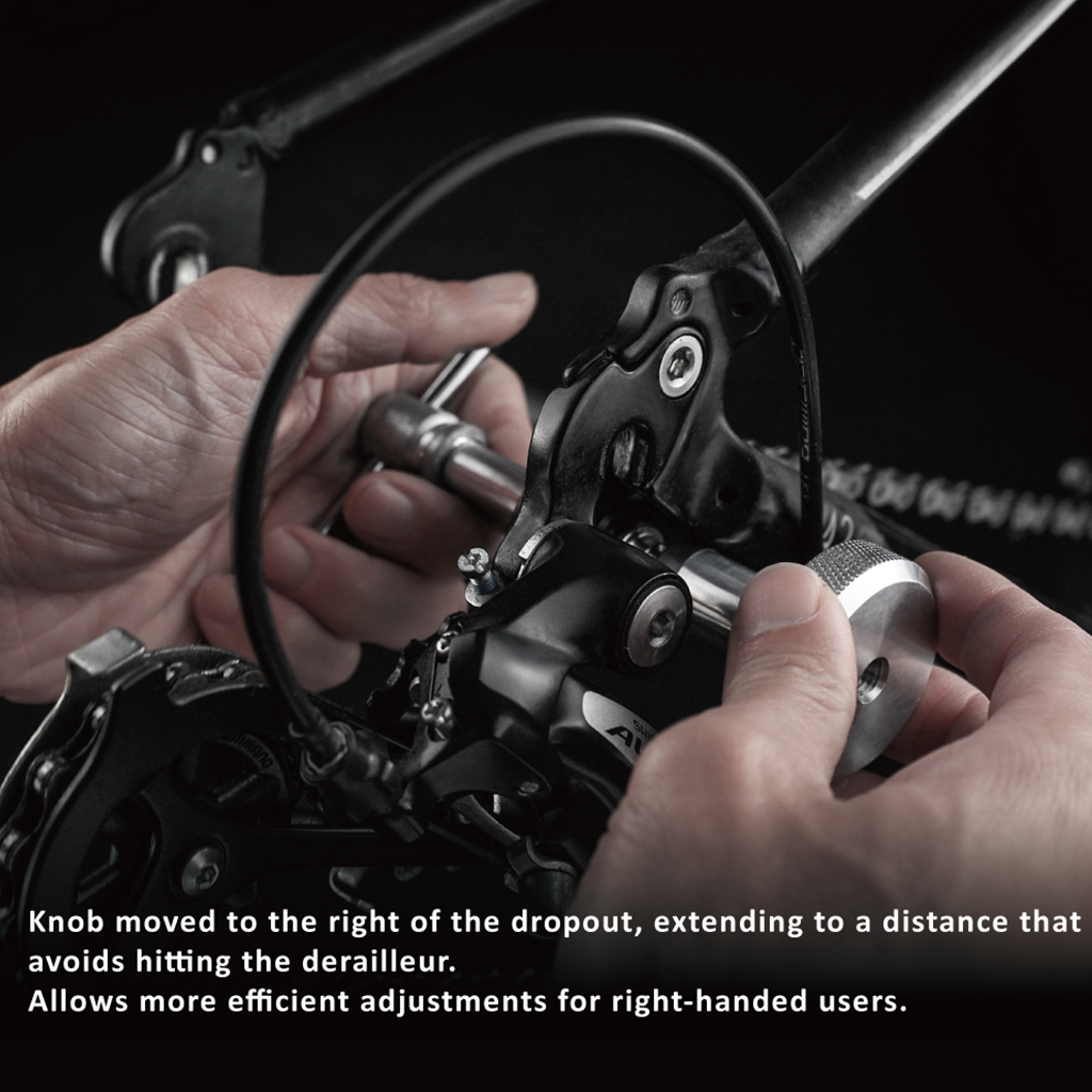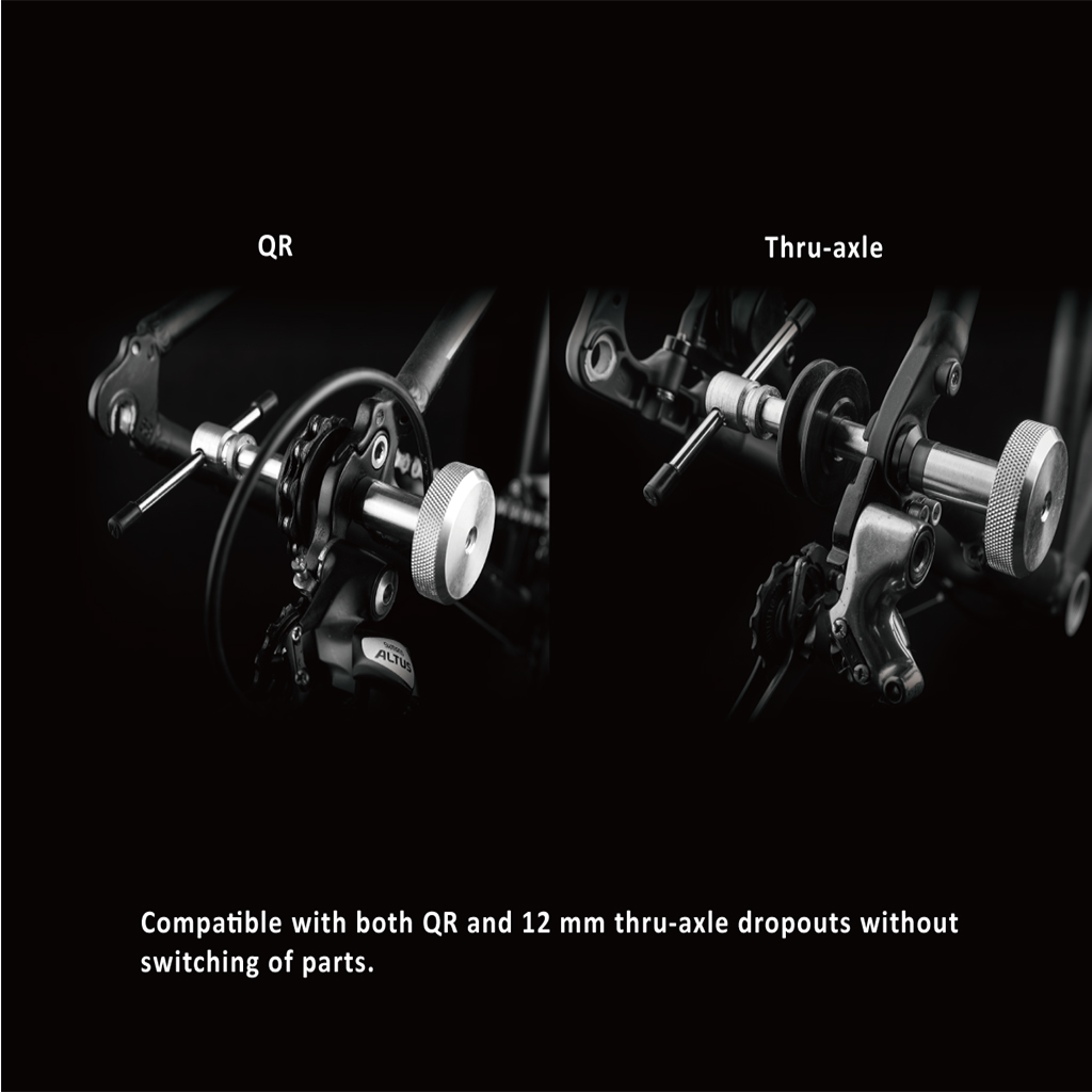 A Chain Keeper (dummy hub) compatible with both QR and 12 mm thru-axle dropouts without switching of parts or adapters.