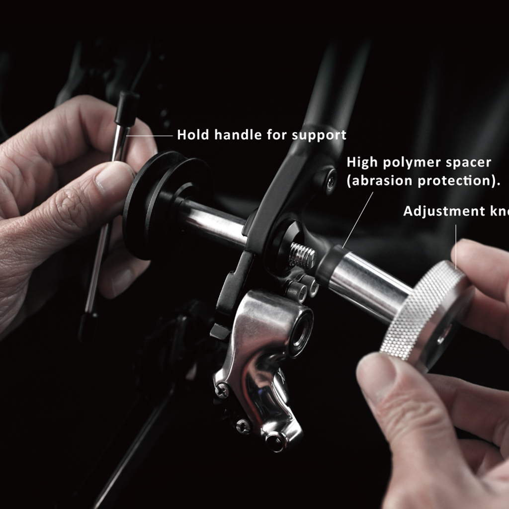 Featuring a free-spinning and side-shifting pulley wheel, allowing shifting of the derailleur and a high polymer spacer providing abrasion protection against dropout surfaces, this is a quick and easy tool to have on hand for routine cleaning and maintenance work.