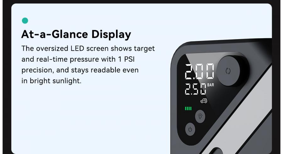 Large LED large screen allows easy reading of preset pressure and real-time pressure values , with a measurement accuracy of ± 𝟏 PSI. Once the target pressure is reached, this tire inflator stopping automatically