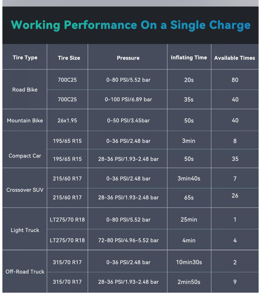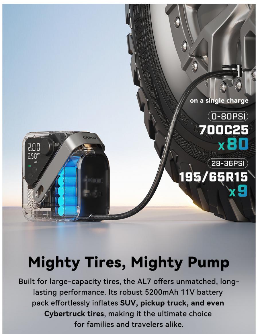 Built for large-capacity tires, the AL7 offers unmatched, long- lasting performance. Its robust 5200mAh 11V battery pack effortlessly inflates SUV, pickup truck, and even Cybertruck tires, making it the ultimate choice for families and travelers alike.