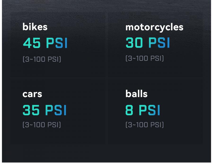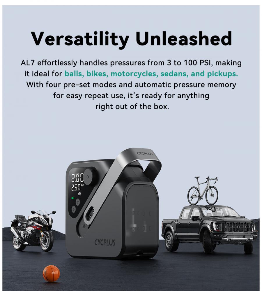 AL7 effortlessly handles pressures from 3 to 100 PSI, making it ideal for balls, bikes, motorcycles, sedans, and pickups. With four pre-set modes and automatic pressure memory for easy repeat use, it's ready for anything right out of the box.
