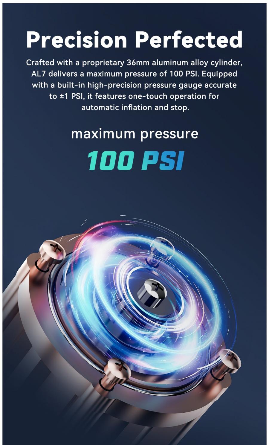 Crafted with a proprietary 36mm aluminum alloy cylinder, AL7 delivers a maximum pressure of 100 PSI. Equipped with a built-in high-precision pressure gauge accurate to +1 PSI, it features one-touch operation for automatic inflation and stop.