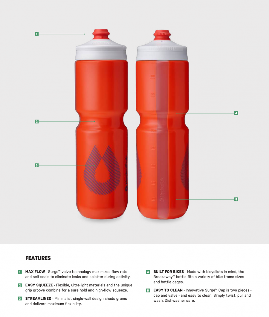 The Breakaway Surge’s beauty is its simplicity. The lightweight performance design starts with our Surge™ Cap — self-sealing, it delivers high-flow hydration on the move. The bottles are slim and ergonomic to fit comfortably and securely in your hand and cage, and the ultrathin side walls make squeezing easy, so focus stays on the ride, not the bottle.