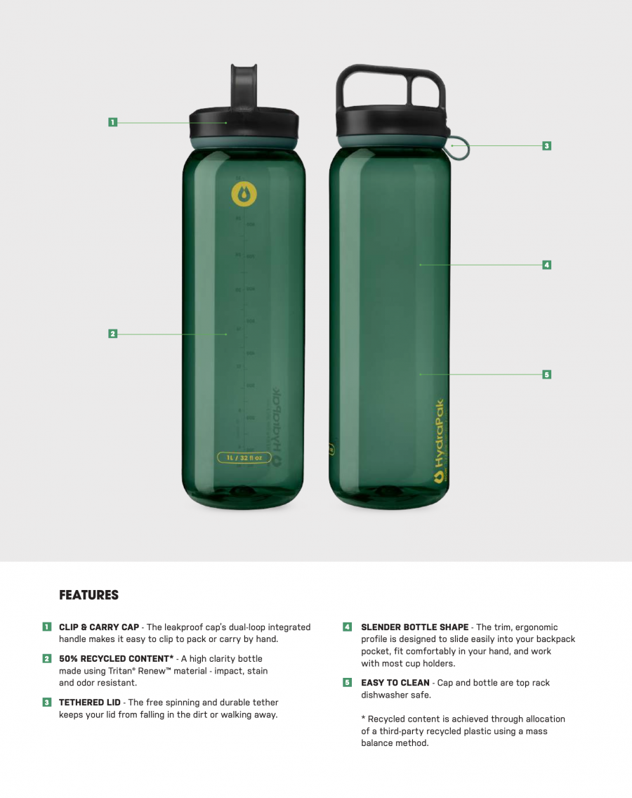 A solid bottle made to go anywhere, all while leaving a lighter footprint. The clear, durable, lightweight RECON™ Clip & Carry bottle is perfect for trail or travel. And — since it’s made from 50% recycled content — it’s a big step towards a more sustainable way to hydrate. The tethered cap seals tight and has an angled handle for clipping and carrying, and the bottle’s slender profile makes it easy to hold, slide into a pack pocket, or drop into your cupholder.