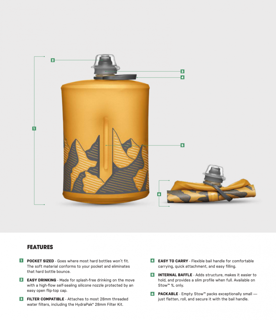 Sized right for short trips — and their smaller packs and pockets — or as the base of a squeeze filter, the Stow™ holds its water, then, when empty, rolls up to stash in places other bottles won’t fit. It’s durable, flexible, has a flip-top cap cover to protect the high-flow and spill-proof nozzle, and an integrated bail handle that makes clipping and carrying easy. And, at a weight that’s 50% lighter than most hard bottles, carrying gets even easier.