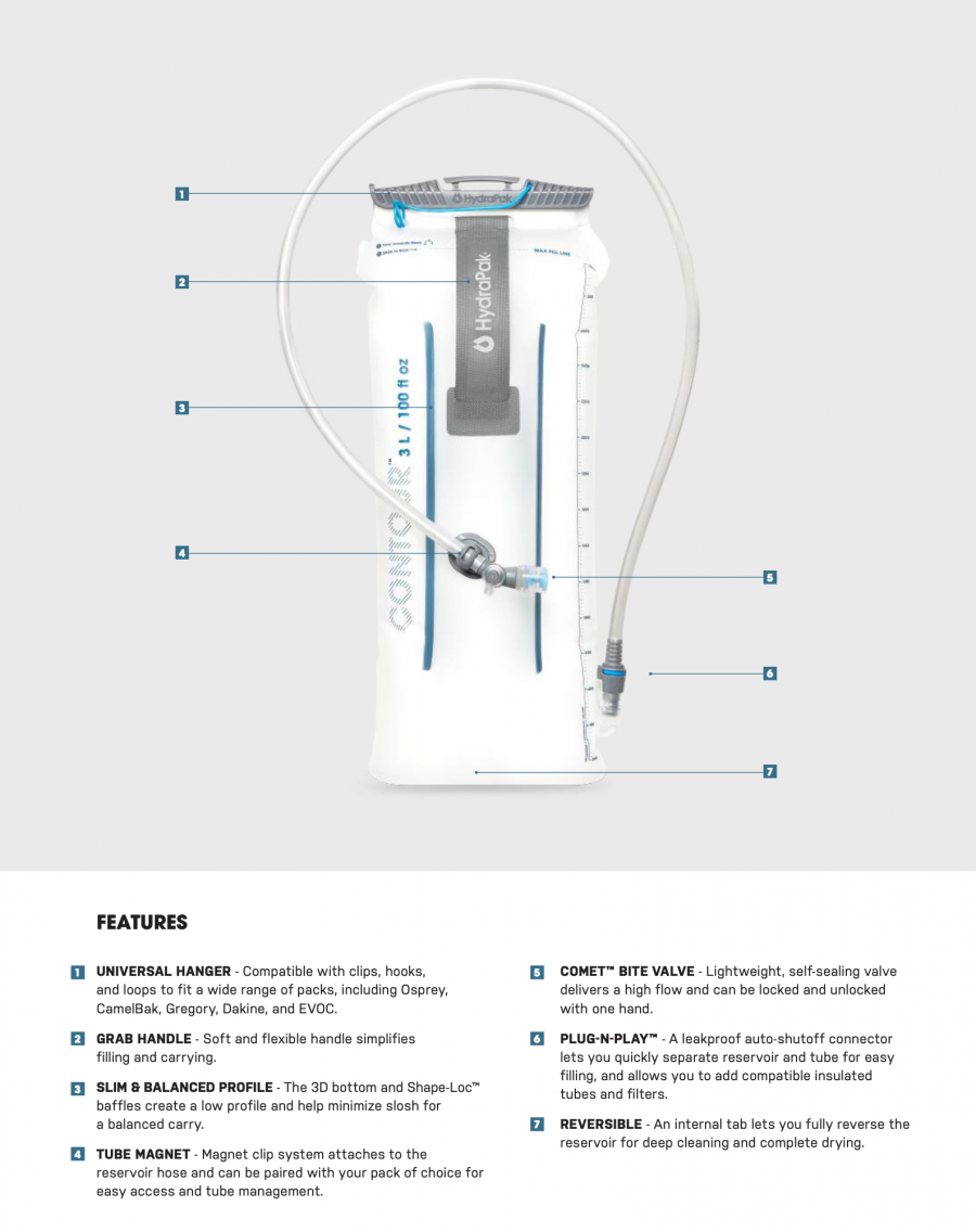The Velocity™ is our lightest reservoir series. Balanced and comfortable, there’s a size to fit any adventure - hike, bike or run. The minimalist design and ultralight materials shed weight, the Comet™ bite valve delivers flow, and the wide opening makes adding ice easy. Our Plug-N-Play™ connector quickly separates the tank from tube for filling and cleaning.