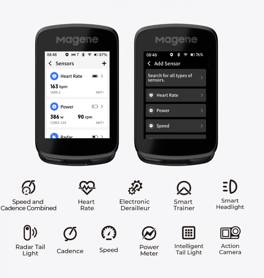 Through ANT+ and Bluetooth wireless protocols, it can connect to a diverse range of sensors and display the battery and real-time data on sensor page
