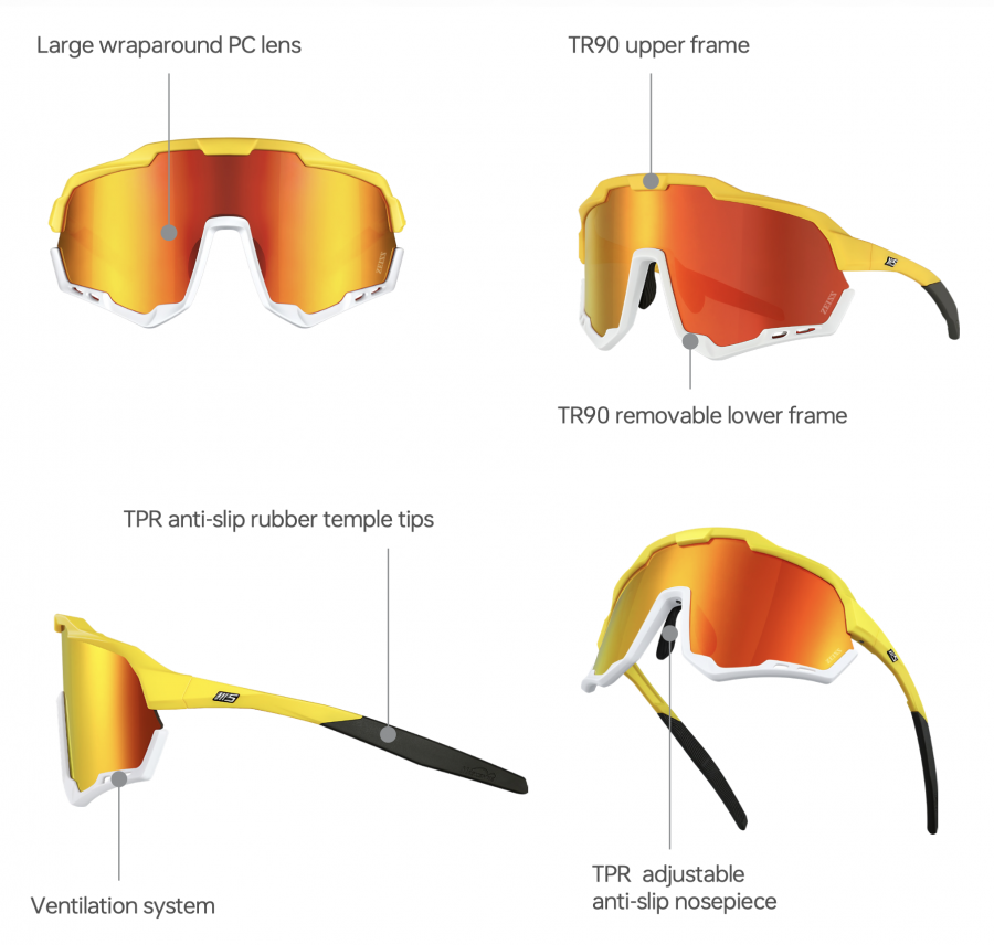 The frame is crafted from ultra-light TR90 for optimal flexibility and strength. Key contact points are wrapped in grippy TPR rubber to prevent slipping. For enhanced fit and adjustability, the nose pads and temple tips incorporate a malleable metal core, allowing the frame to mold naturally to your head shape for a truly custom fit. The unique pattern design on the temple tips and nose pieces improves grip and enhances sunglass retention, ensuring the glasses stay firmly in place—even through sweat, speed, and vibration.
