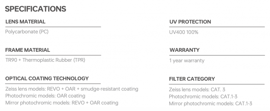 The mirror photochromic mode pairs light-adaptive tinting with visual flair. Its front-facing REVO coating gradually reveals a rich mirror finish as UV intensity increases, boosting contrast and visibility. A rear OAR layer ensures clear, glare-free optics even under challenging sunlight.