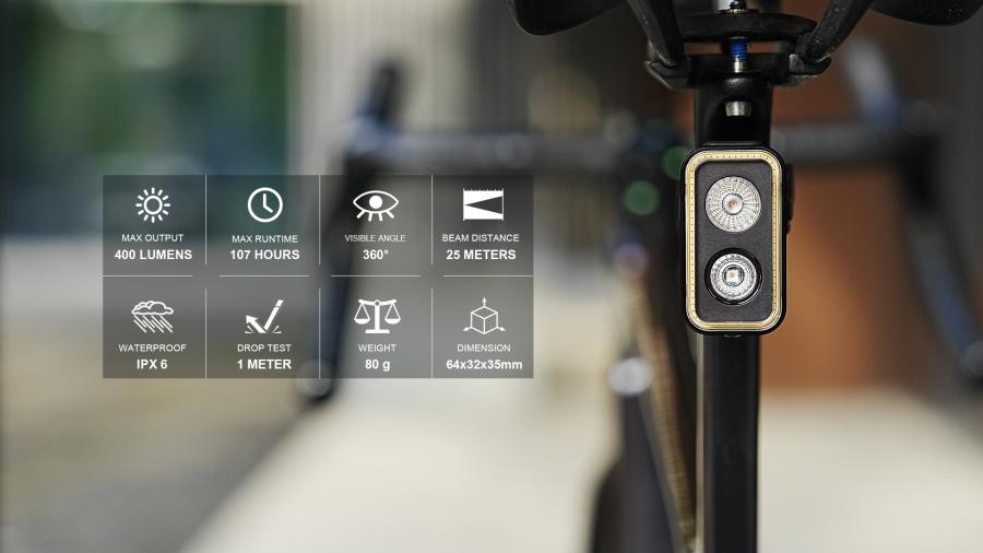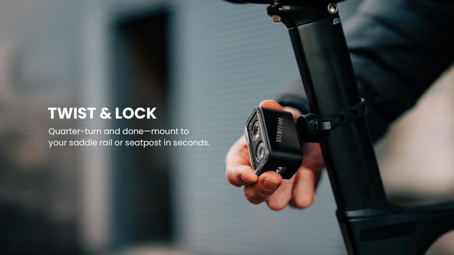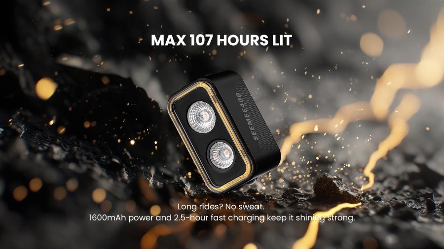 SEEMEE 400 delivers up to 107 hours of runtime, USB-C fast charging, and a lockout function to prevent accidental activation. Its IPX6 waterproof rating ensures all-weather reliability, while the quarter-turn mount offers quick, secure installation on seatposts or saddle rails.