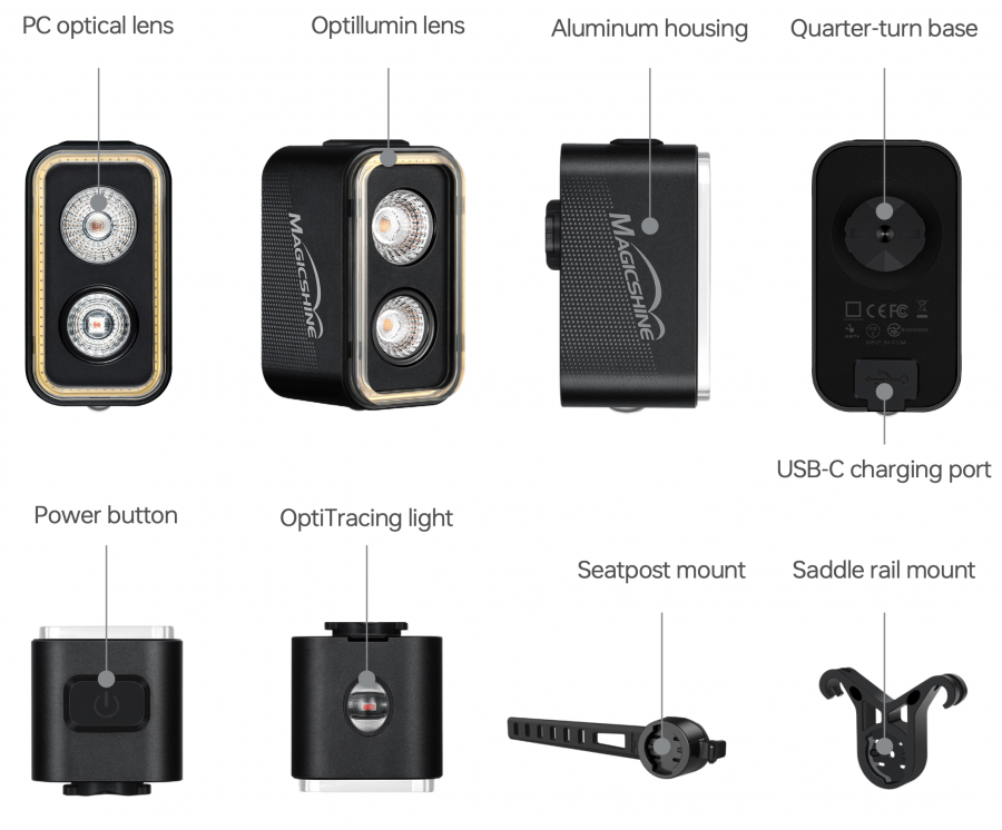 Both SEEMEE 300 and SEEMEE 400 feature Magicshine’s signature OptiTracing light, projecting a 360° glowing halo onto the road for all-around visibility—a favorite among pro cyclists for its unmistakable presence in low light condition. The Optillumin lens remains the same across both models, offering powerful rear and side illumination through a compact, clean design.