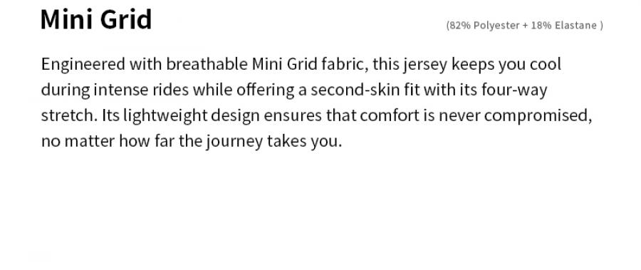 The Traveler Series is built for those who thrive on adventure, blending performance with style. Engineered with breathable Mini Grid fabric, this jersey keeps you cool during intense rides while offering a second-skin fit with its four-way stretch. Its lightweight design ensures that comfort is never compromised, no matter how far the journey takes you.