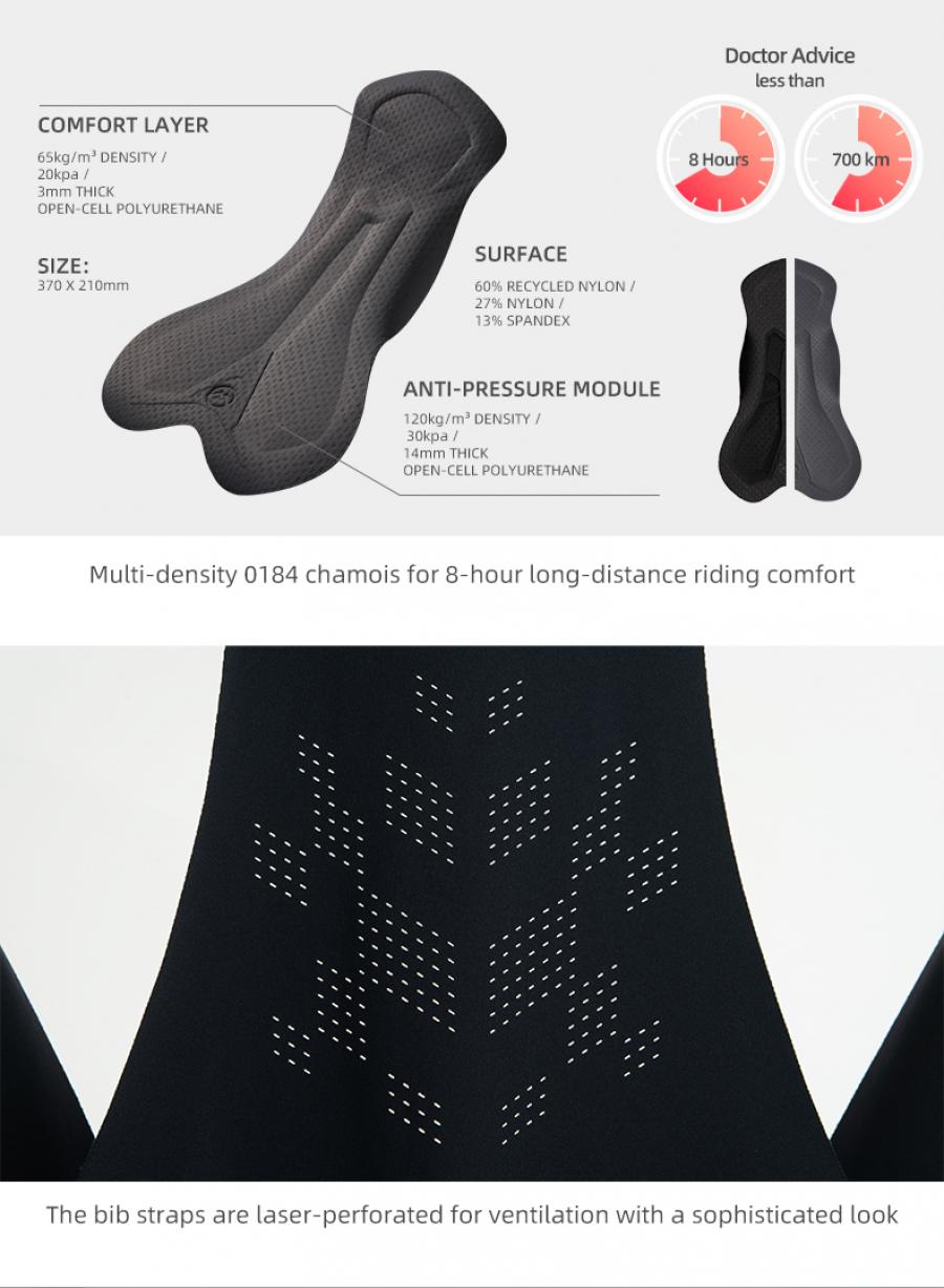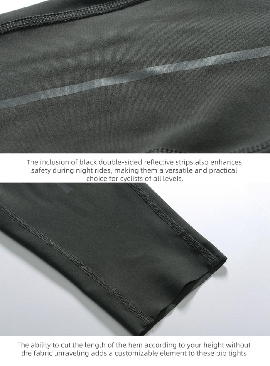 The gender-specific multi-layer 0184 chamois padding is a standout feature of these bib tights, offering unparalleled comfort and support. The innovative anti-vibration thickness of 3-14mm eliminates pressure build-up in the pubic area, making long rides more comfortable. Additionally, the ability to cut the length of the hem according to your height without the fabric unraveling adds a customizable element to these bib tights. The inclusion of black double-sided reflective strips also enhances safety during night rides, making them a versatile and practical choice for cyclists of all levels.