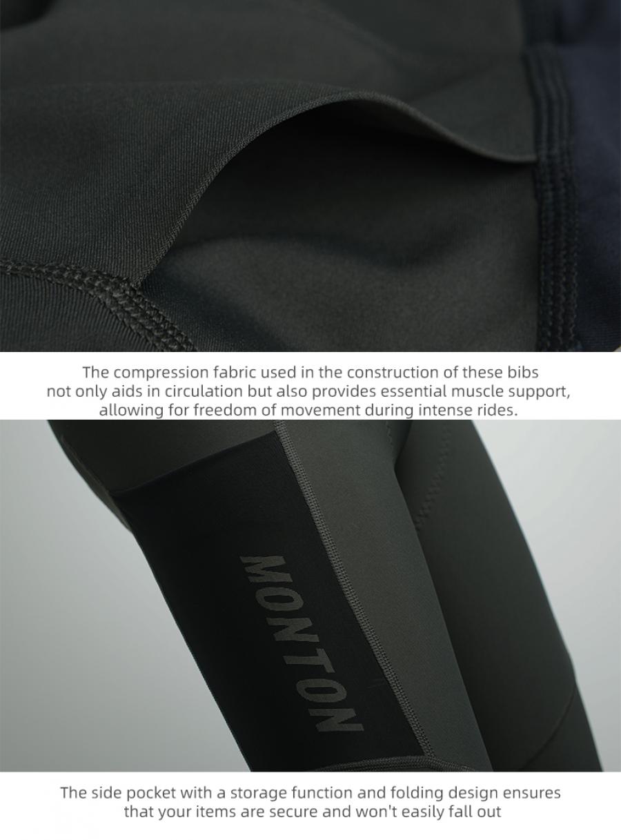 These cycling bib tights with side pockets are the ultimate choice for any cyclist looking for comfort and performance during long-distance rides. The compression fabric used in the construction of these bibs not only aids in circulation but also provides essential muscle support, allowing for freedom of movement during intense rides. The side pocket with a storage function and folding design ensures that your items are secure and won't easily fall out, adding convenience to your cycling experience.