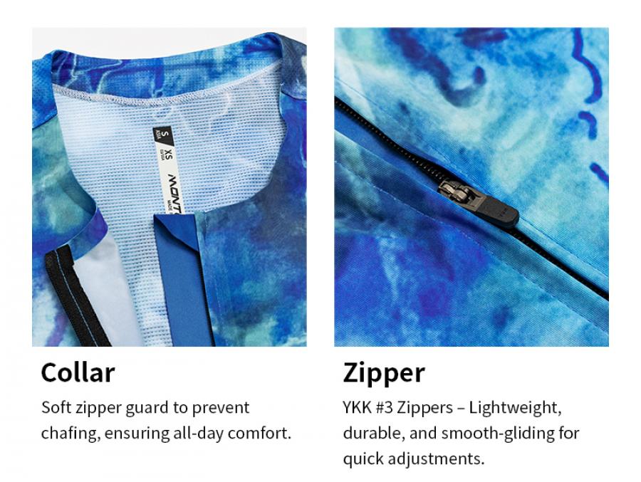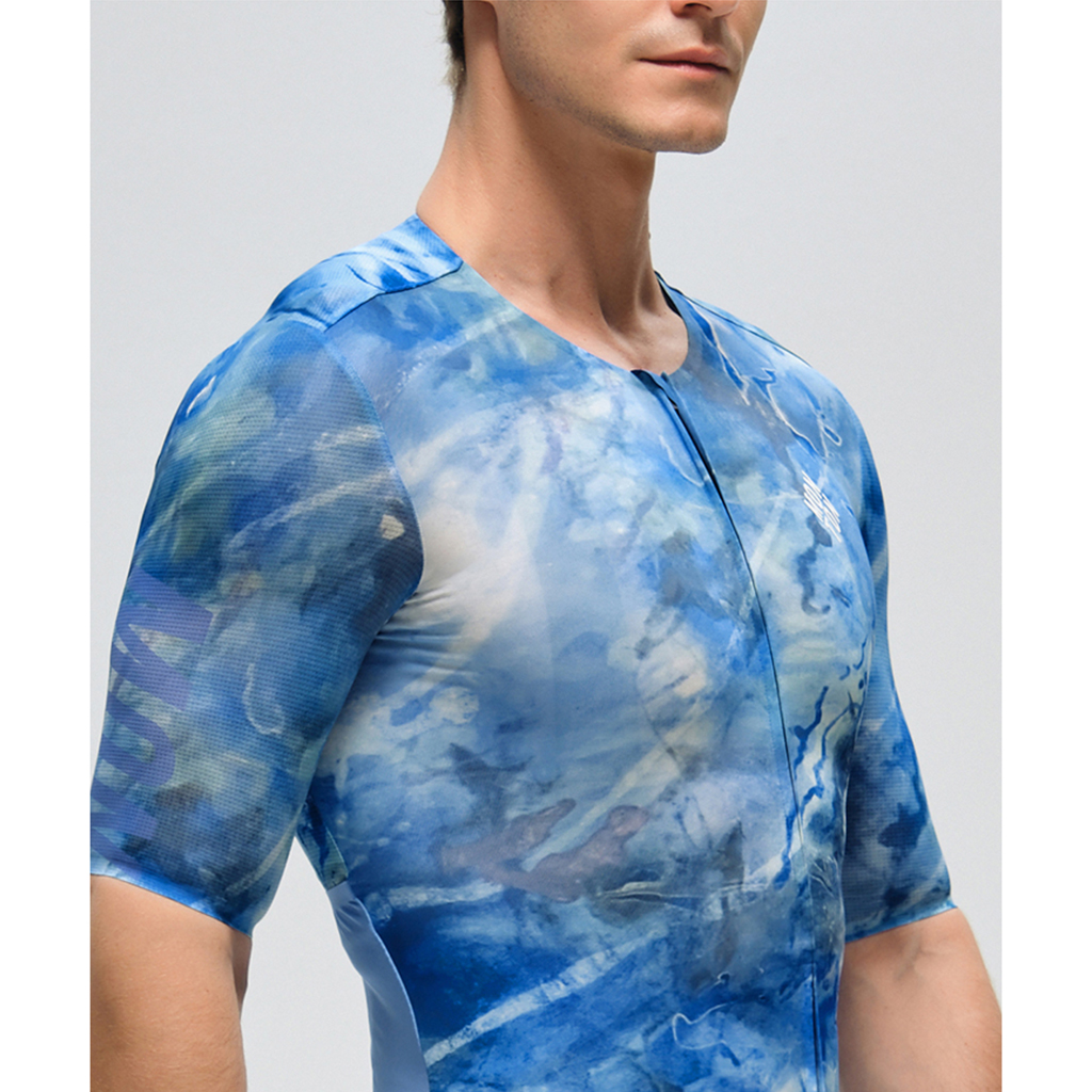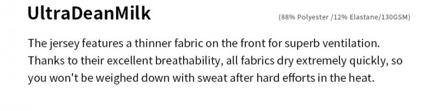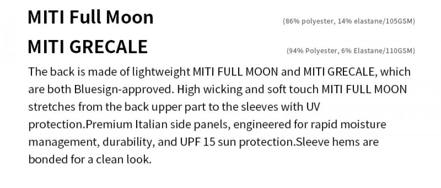 The jersey features a thinner fabric on the front for superb ventilation. The back is made of lightweight MITI FULL MOON and MITI GRECALE, which are both Bluesign-approved. High wicking and soft touch MITI FULL MOON stretches from the back upper part to the sleeves with UV protection.