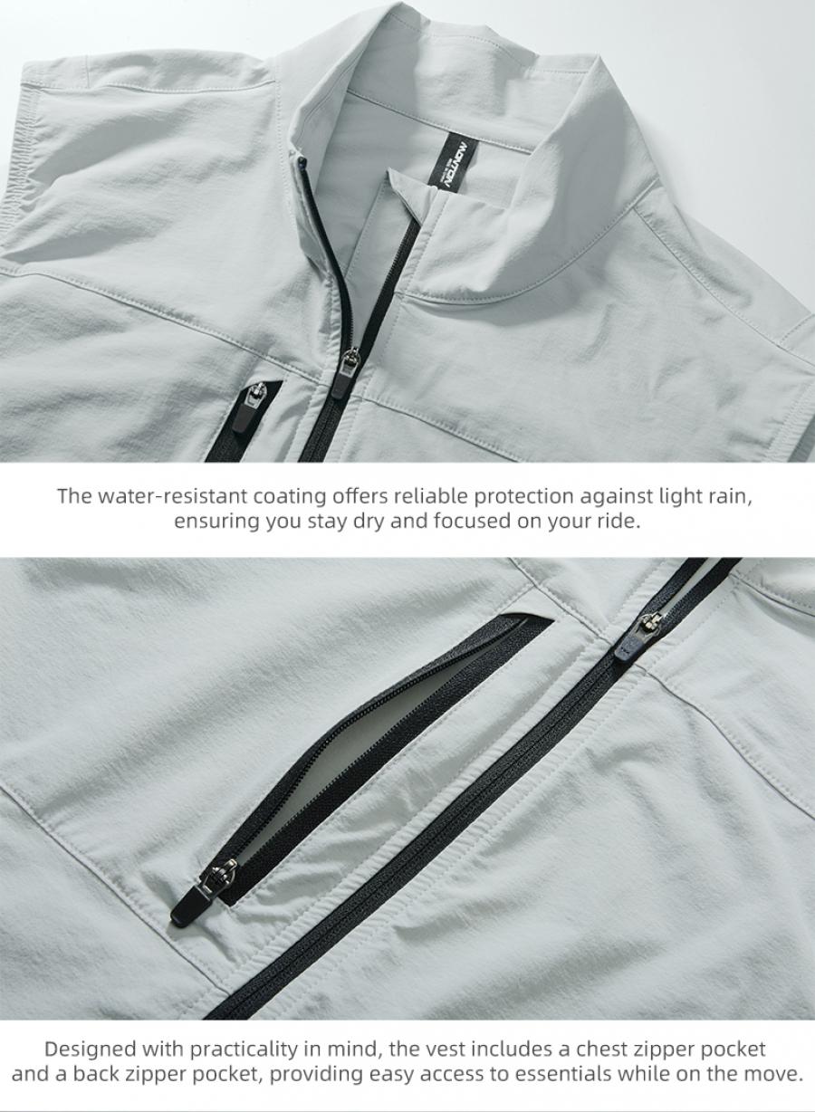 Designed with practicality in mind, the vest includes a chest zipper pocket and a back zipper pocket, providing easy access to essentials while on the move.