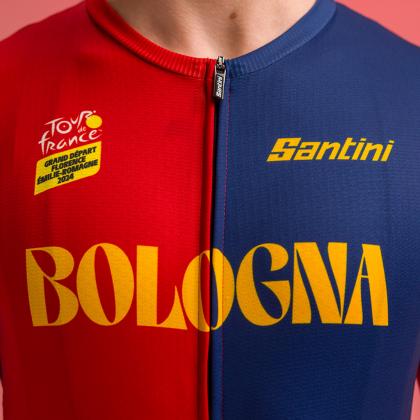 The Bologna jersey is dedicated to the second stage of the Tour de France and captures the spirit of this city, blending sporting passion and tradition in a single jersey. The kit's colors are those distinctive of Bologna's football team, while the back features a series of graphic elements that recall some of the city's most iconic symbols: the Asinelli Tower, the city's flag, Neptune's fountain trident, and spaghetti Bolognese.