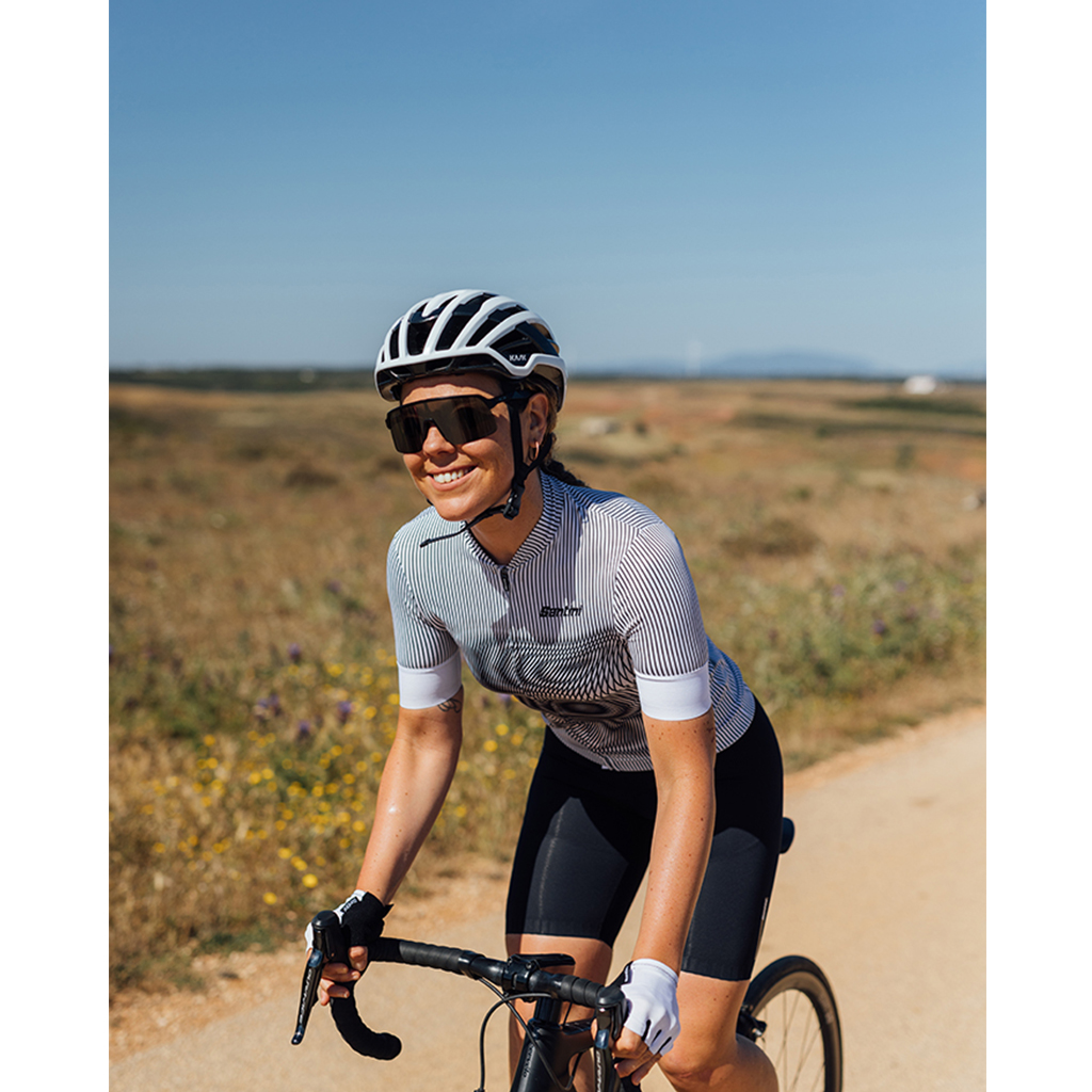 Made of premium fit Italian fabric, incredibly stretch, and highly compressive but with a soft feel on the skin. Made of recycled polyamide and featuring a matte finish for a clean, classy look. Front seamless elastic braces cling to the body without restriction. Extremely light and elastic mesh on the rear for perfect ventilation. Internal anti-slip coloured leg gripper to keep the bib-shorts in place while pedaling.