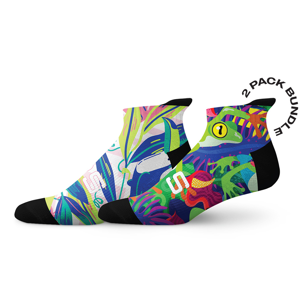 Step into a tropical paradise with the Birds and Frogs Tab Socks Combo. This vibrant duo features a bold jungle bird design on one pair and a playful frog pattern on the other. Each sock bursts with unique energy, keeping your look fresh and wild.