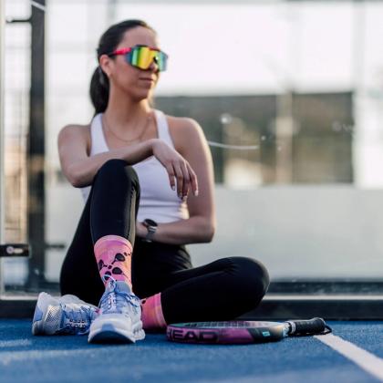 The Criss Cross Padel Crew Socks combine vibrant energy and unbeatable performance. The design has a wavy background of pinks and oranges with black paddle and ball graphics. These socks are a perfect fusion of style and function. They have reinforced padding and targeted support to keep you light on your feet.