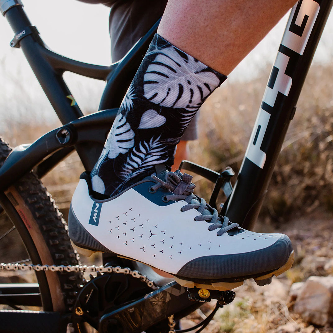 The Dark Night Cycling Crew Socks feature a grayscale tropical leaf pattern. This design will match any cycling kit or activewear. They are a sleek and stylish option for your next ride or workout. These socks are built for comfort and durability.
