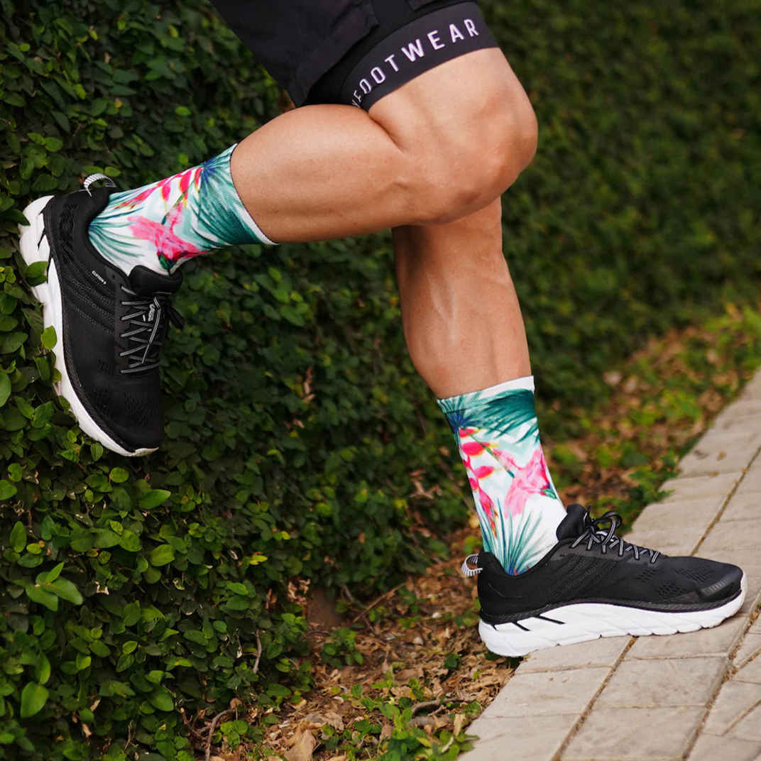 The Pastel Paradise Casual Crew Socks have a true summertime feeling. The design features a blend of leaves, birds-of-paradise, and hibiscus flowers in pastel tropical colours. They are perfect for adding a pop of colour to any outfit. They are comfortable and durable for any occasion.