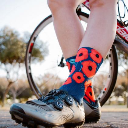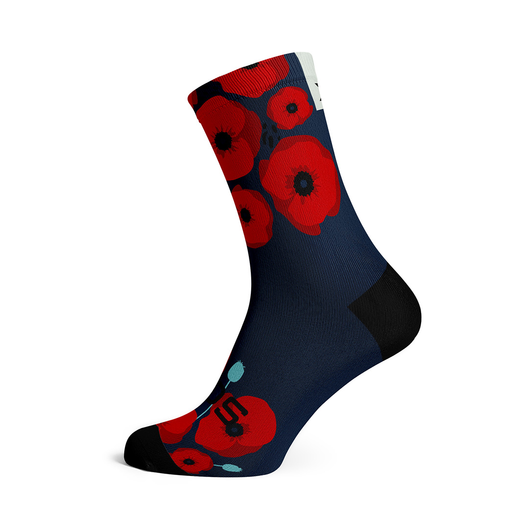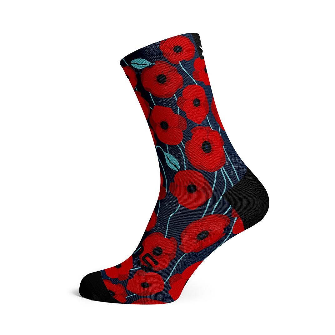 The Poppy Running Crew Socks feature bright red poppy flowers on a navy background. This unique left-right sock design celebrates individuality. They are perfect for runners who want to stand out from the crowd.