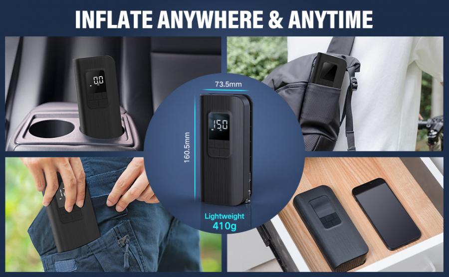 TOPUMP TP100 electric pump features an integrated air hose with its own storage space, eliminating the need for extra accessories. Weighing just 0.90 pounds and featuring a compact design, this bike pump portable is easy to store in your backpack, pocket, bike rack, or car console for use anytime, anywhere.