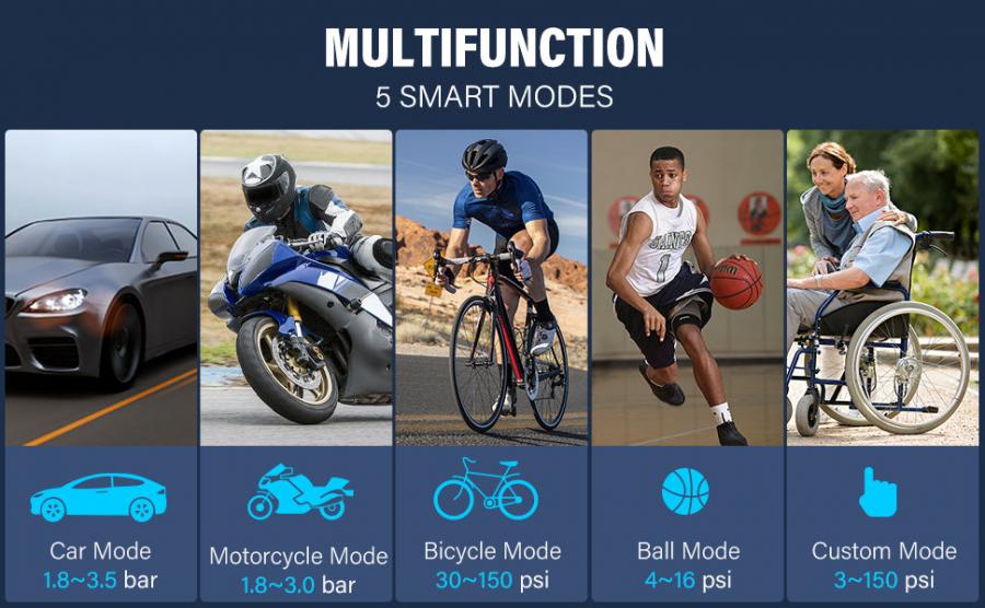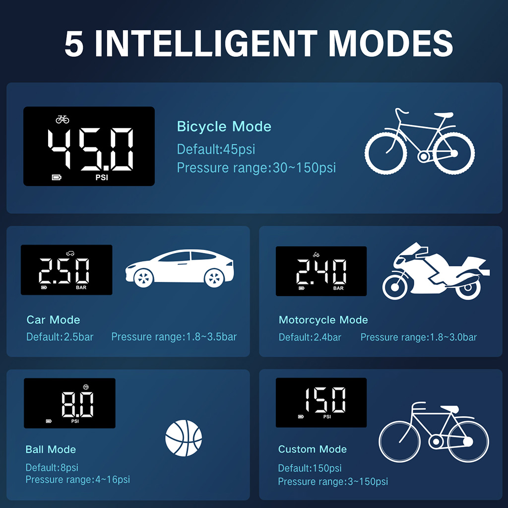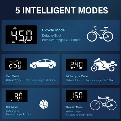 The bicycle pump with pressure gauge features 4 preset modes (car, bike, motorcycle, basketball) and a custom mode. Built-in LED lights for tire inflation and emergencies. Ideal for outdoor activities utdoor activities, traveling, cycling, and camping.