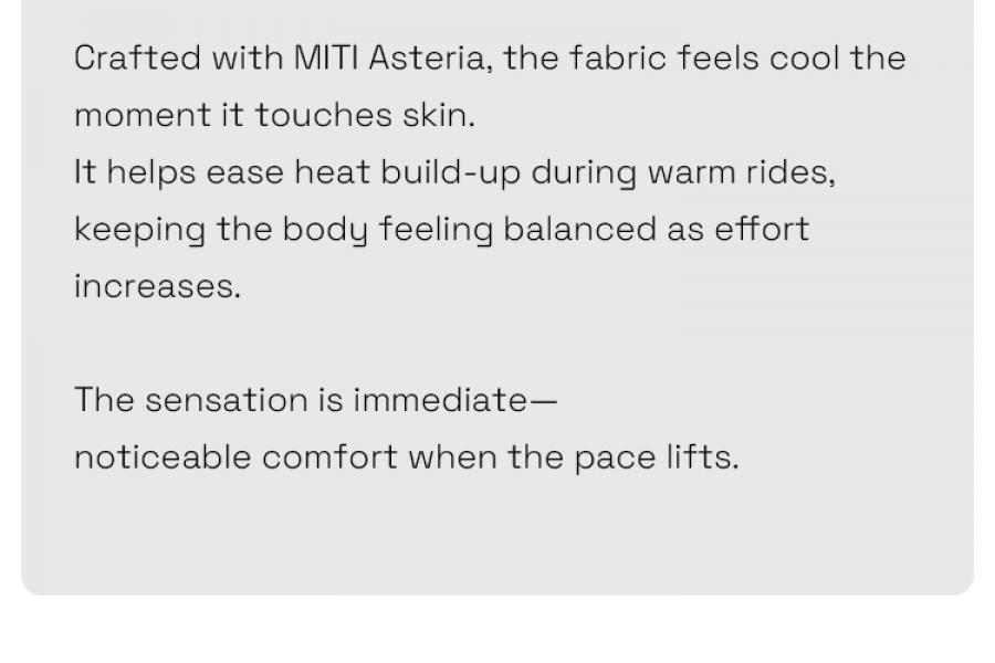 Crafted with Italian MITI Asteria fabric, the jersey feels cool on contact and helps regulate heat as intensity rises, keeping the body balanced when the pace lifts.