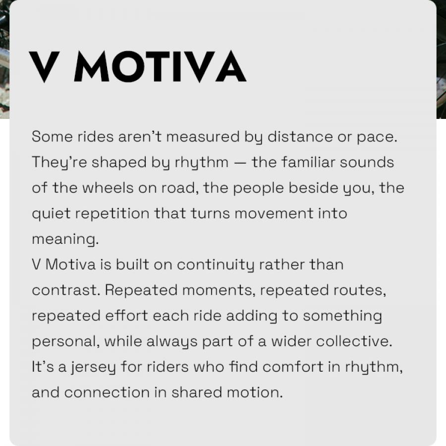 V Motiva is built on continuity rather than contrast, repeated routes, shared motion, and the steady accumulation of effort that turns movement into meaning. It's a jersey for riders who find comfort in flow, and connection in riding together.