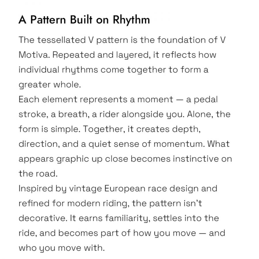 The tessellated V pattern forms the foundation of V Motiva. Repeated and layered, it reflects how individual rhythms come together to create something larger, moments of effort, breath, and presence, building a quiet sense of momentum on the road.