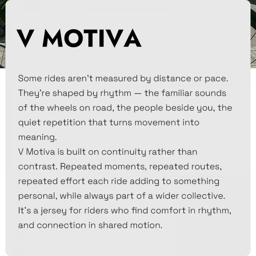 V Motiva is built on continuity rather than contrast, repeated routes, shared motion, and the steady accumulation of effort that turns movement into meaning. It's a jersey for riders who find comfort in flow, and connection in riding together.