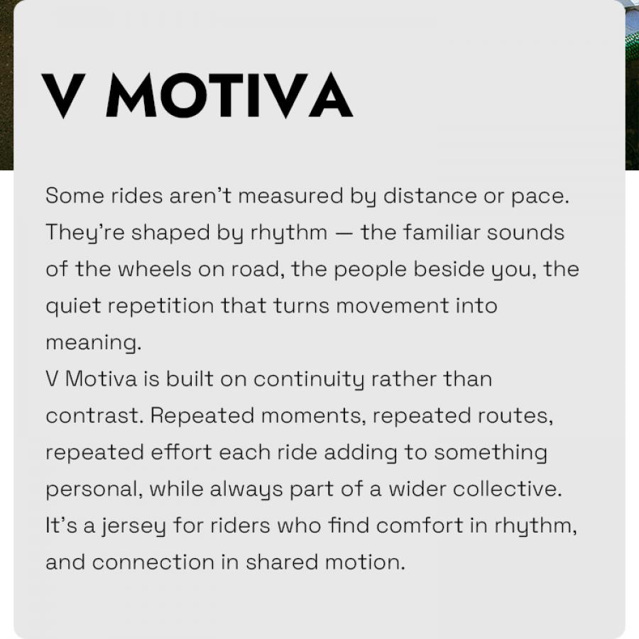 V Motiva is built on continuity rather than contrast, repeated routes, shared motion, and the steady accumulation of effort that turns movement into meaning. It's a jersey for riders who find comfort in flow, and connection in riding together.